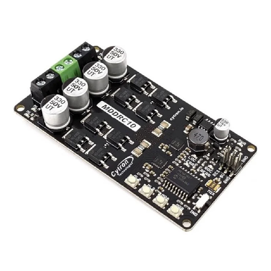 Selectable mixed-mode allows the differential drive motors to be controlled from a throttle (forward-reverse) and a steering channel. Onboard switching regulator which produces 5V output is also available to power the RC receiver. This eliminates the need for an extra battery eliminator circuit (BEC).