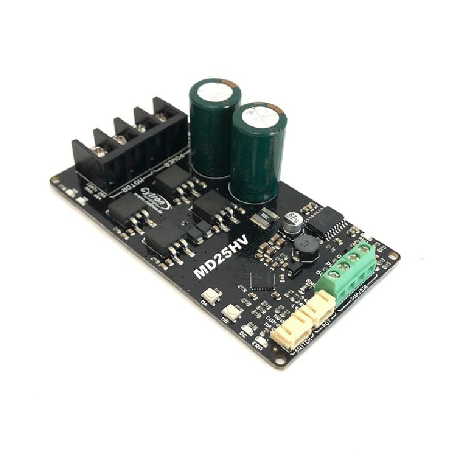 The Cytron 25A 7V-58V DC motor driver with Switch and Potentiometer Control (MD25HV POT) is a high voltage single channel bidirectional motor driver for DC motor from 7V to 58V. With discrete NMOS H-Bridge design, this motor driver is able to support 25A continuously without an additional heatsink.