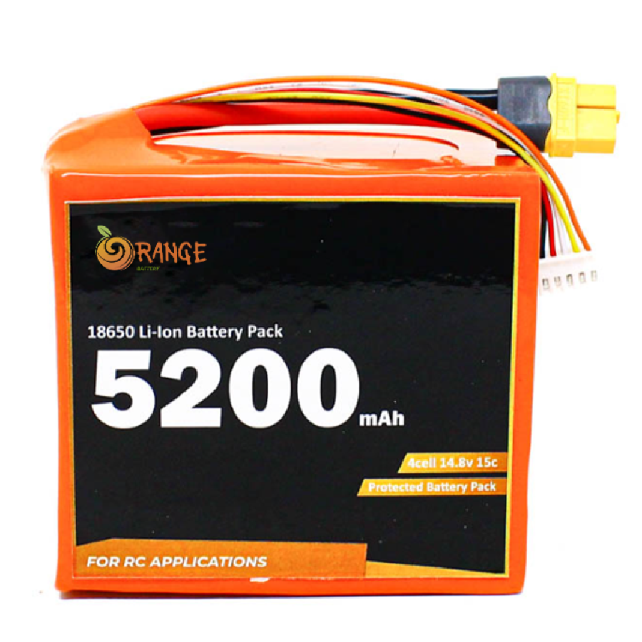 Orange ISR 18650 Li-Ion 5200mAh 14.8V 4S4P Protected Battery Pack – 15c (Li-ion) equipped with heavy duty discharge leads to minimize resistance and sustain high current loads. Orange batteries stand up to the punishing extremes of aerobatic flight and RC vehicles. Each pack is equipped with gold plated connectors and XT60 Female Connector, balance connectors. All Orange Lithium Polymer batteries packs are assembled using IR matched cells.
